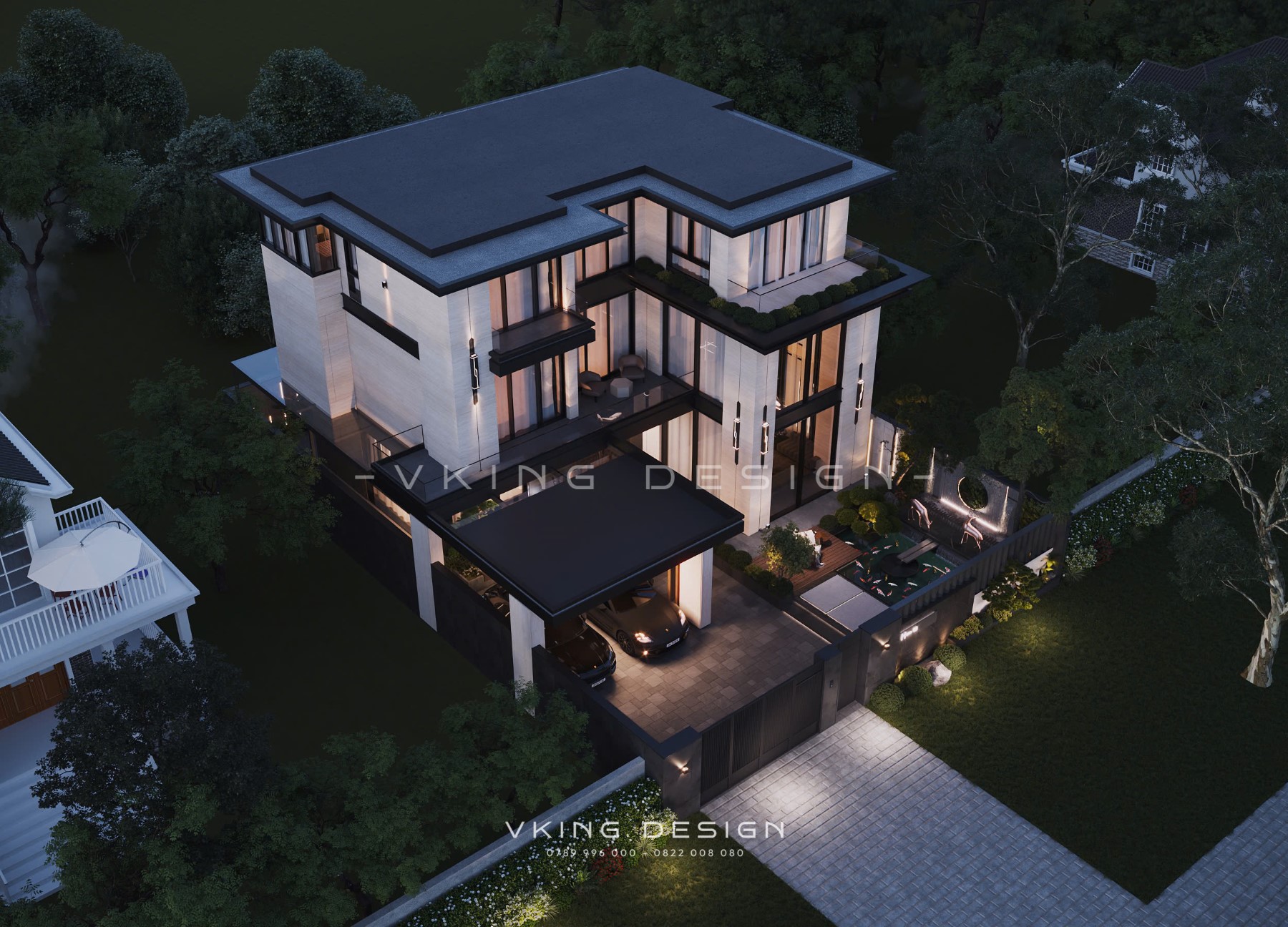 Từ góc nhìn trên cao, tổng thể căn biệt thự như một khu nghỉ dưỡng mini nơi hình khối, ánh sáng, vật liệu và thiên nhiên giao thoa với nhau một cách mềm mại. Các khoảng ban công mở rộng được đặt đúng vị trí, giúp căn nhà đón gió, đón sáng và mở rộng không gian sống. Dù là ban ngày hay ban đêm, căn biệt thự 3 tầng VK25072 đều giữ được phong thái sang trọng và tinh tế, như một công trình biết cách khoe vẻ đẹp đúng lúc vừa đủ, không phô nhưng vẫn khiến người ta phải dừng lại ngắm nhìn.
