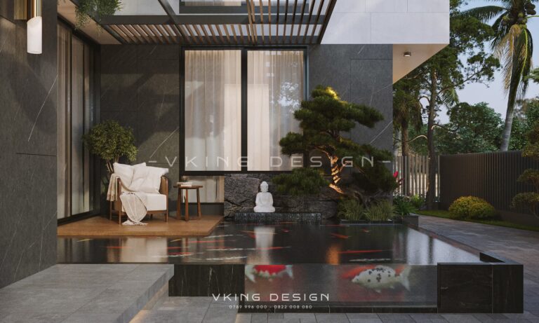 Điểm nhấn đặc biệt khiến căn biệt thự VK25067 trở nên khác biệt chính là không gian sân vườn và hồ nước bao quanh. Trước mặt là mặt hồ phẳng lặng, in bóng những tán dừa xanh và khóm hoa súng nở rộ, mang lại cảm giác yên bình hiếm có giữa đời sống hiện đại. Trong khuôn viên biệt thự, hồ cá Koi được thiết kế tinh tế với mặt nước trong vắt, phản chiếu ánh đèn vàng và bóng cây bonsai tạo nên khung cảnh thiền tĩnh, an nhiên. Một góc nhỏ được bố trí ghế nghỉ và tượng Phật, nơi gia chủ có thể thả mình trong không gian tĩnh lặng, lắng nghe tiếng nước chảy, tiếng cá quẫy nhẹ và tận hưởng những phút giây an yên tuyệt đối.