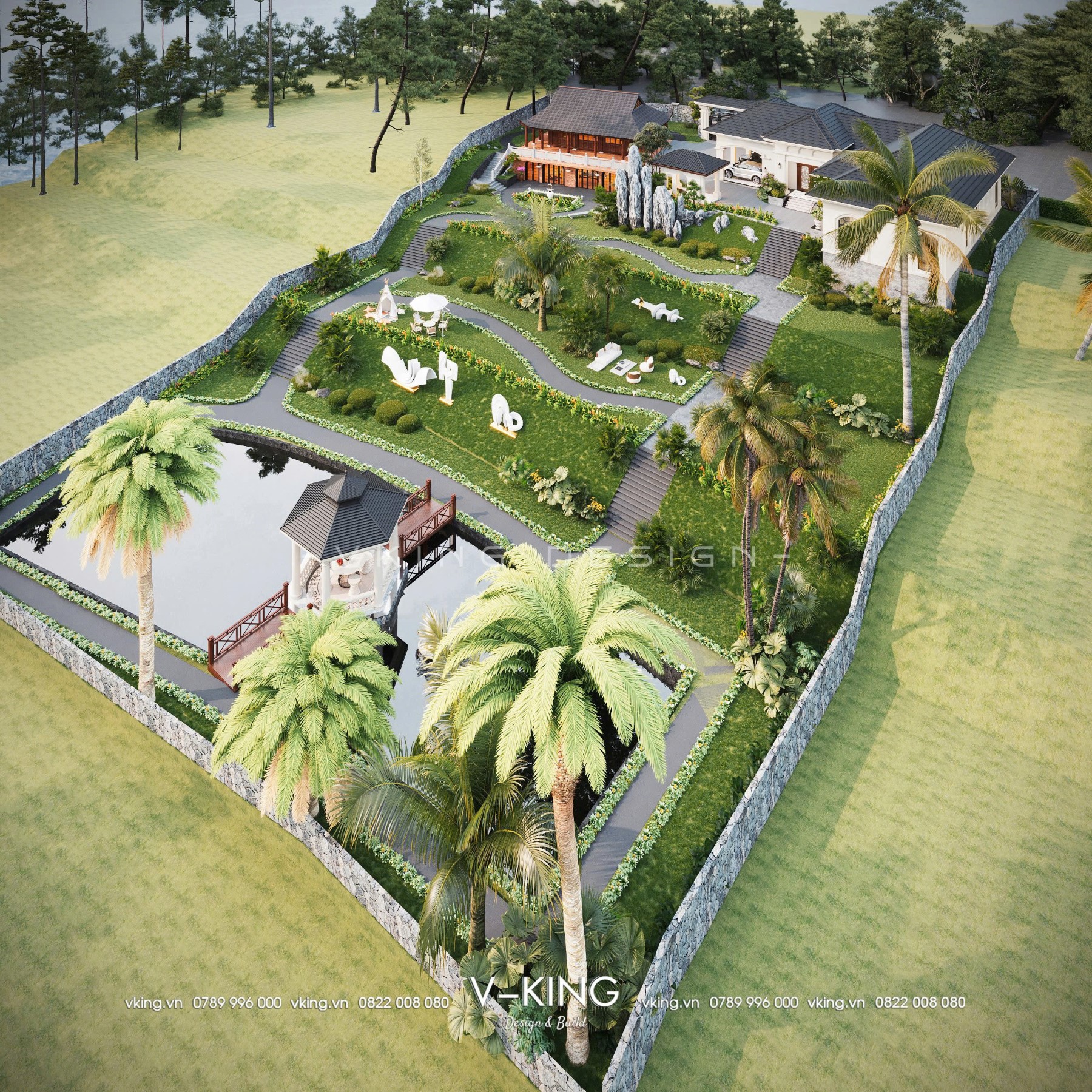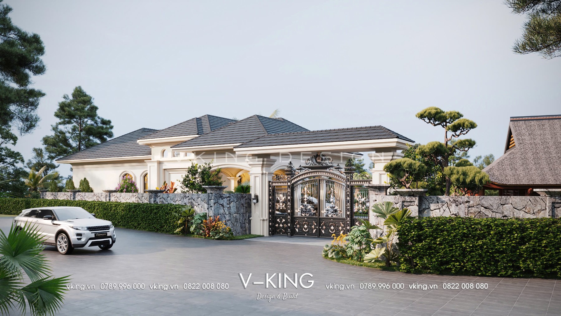Căn biệt thự tân cổ điển 1 tầng VK25003 hiện lên như một tuyệt tác kiến trúc giữa không gian sân vườn rộng lớn, bao bọc bởi sắc xanh mướt mắt của cỏ cây và hồ nước uốn lượn mềm mại. Tổng thể khuôn viên được thiết kế như một khu nghỉ dưỡng cao cấp, nơi con người và thiên nhiên giao hòa trong từng đường nét. Những lối đi lát đá xen lẫn thảm cỏ, những bậc tam cấp nối tiếp nhau dẫn lên khu nhà chính như một hành trình bước vào chốn yên bình.