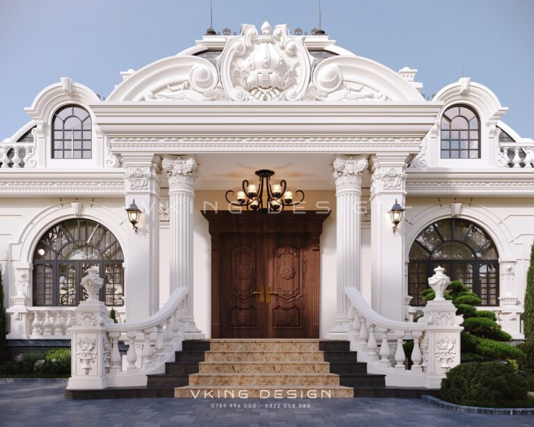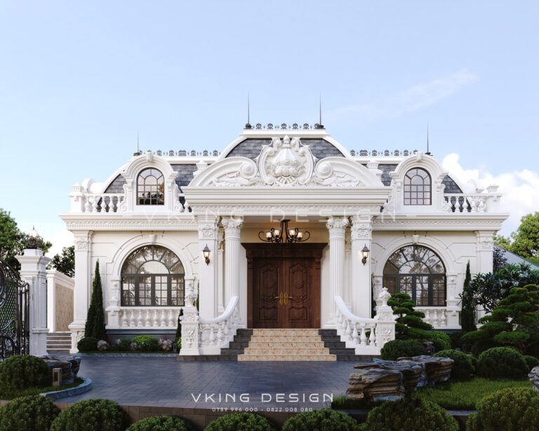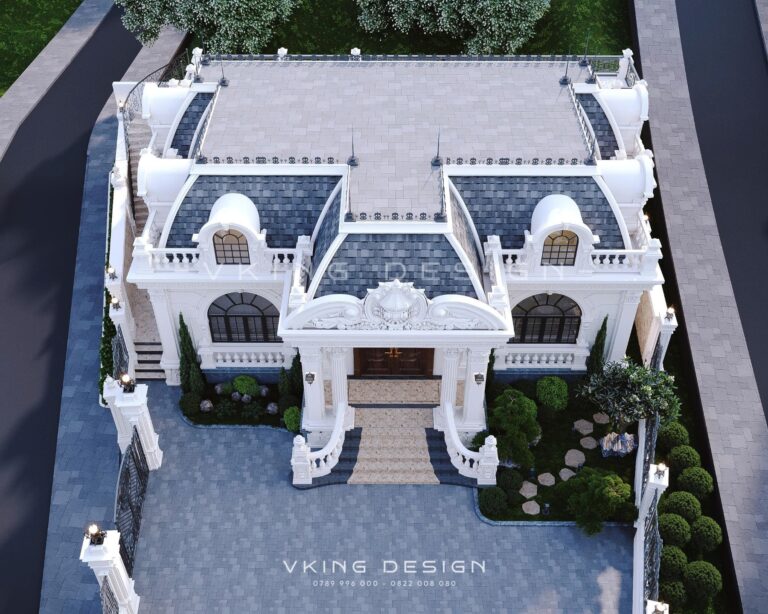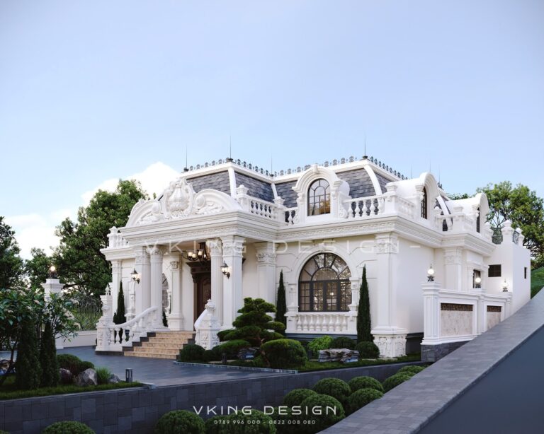 Từ con dốc nhỏ dẫn vào khuôn viên, hình ảnh căn biệt thự trắng nổi bật giữa thảm xanh khiến ai đi ngang qua cũng phải ngước nhìn. Không phải vì sự phô trương, mà bởi cảm giác “đẹp một cách có gu” – thứ khiến người ta vừa tò mò, vừa muốn ngắm thật lâu. Căn biệt thự tân cổ điển 1 tầng mái mansard VK25057 mang trong mình dáng vẻ của một quý cô châu Âu kiêu kỳ, thanh lịch nhưng vẫn đầy sức sống. Từng chi tiết đều được chăm chút như một bản nhạc cổ điển được chơi lại bằng âm thanh hiện đại mềm mại, nhưng vẫn sang trọng và đẳng cấp đến từng nốt. Hãy cùng Kiến trúc VKING khám phá từng góc cạnh của căn biệt thự tân cổ điển 1 tầng mái mansard VK25057 nhé!