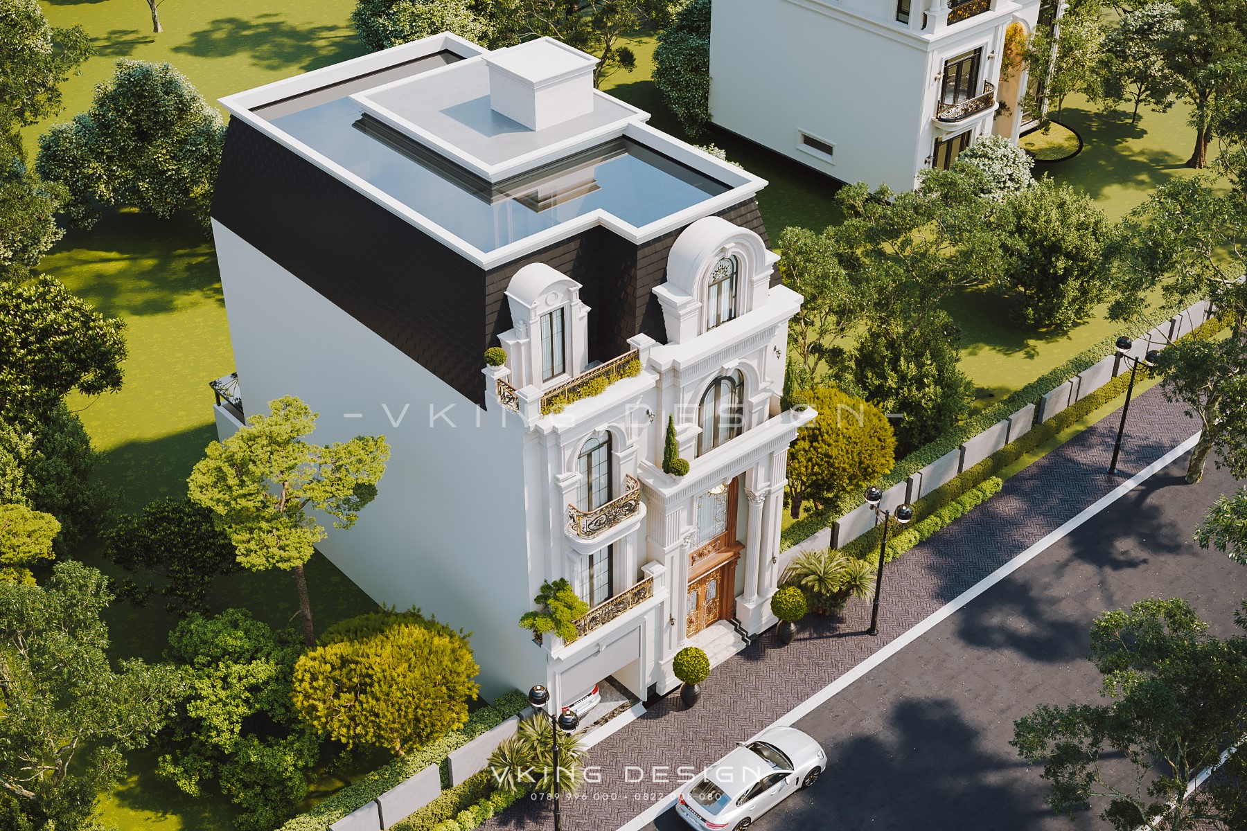 Nhìn từ trên cao, phần tum và sân thượng được bố trí gọn gàng phía sau mái, đảm bảo công năng sử dụng mà không làm phá vỡ hình khối mặt đứng. Đây là giải pháp thiết kế thông minh giúp công trình giữ được vẻ đẹp tân cổ điển trong khi vẫn đáp ứng nhu cầu sinh hoạt hiện đại.