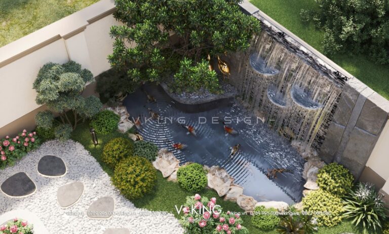 Đến với khu vực sân sau, gia chủ sẽ lạc vào một thế giới khác – nơi thiên nhiên được tôn vinh bằng bàn tay khéo léo của con người. Lối đi lát đá uốn lượn giữa những thảm cỏ xanh rì, dẫn lối về những góc sân ngập tràn hương hoa và tiếng nước róc rách. Thác nước nhân tạo nhỏ nhắn được bố trí khéo léo, nơi dòng nước nhẹ nhàng tuôn chảy, thì thầm những bản nhạc dịu dàng bên tai. Sự hiện diện của thác nước không chỉ làm mát không khí mà còn mang đến cho khu vườn sự sống động, giúp từng khoảnh khắc trong khuôn viên ngập tràn sự thư thái và an nhiên.