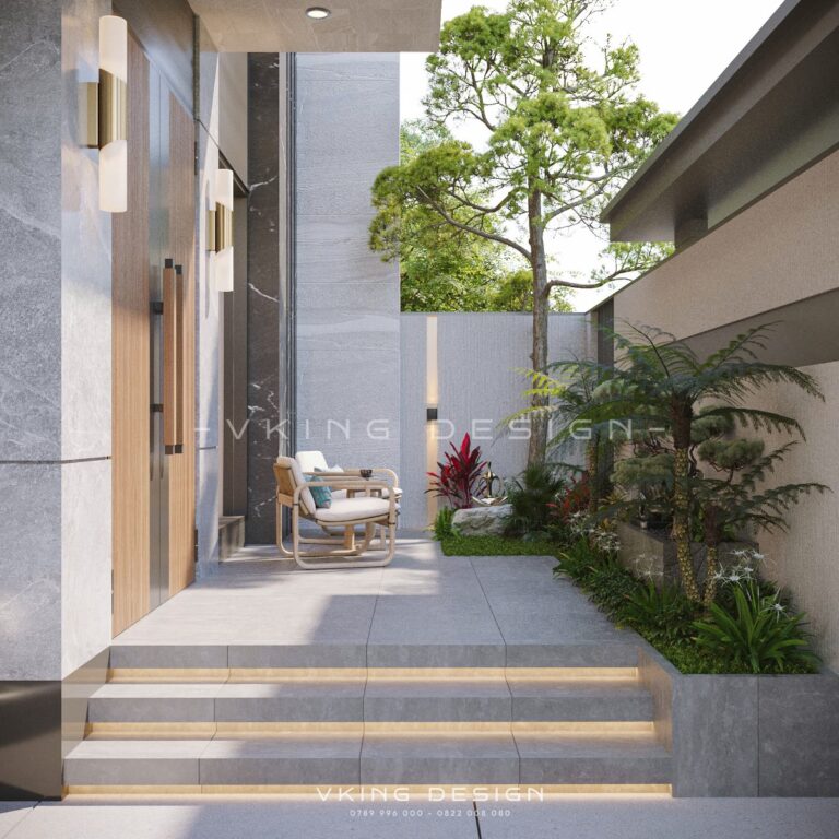 Một điểm đặc biệt trong thiết kế của căn biệt thự phố này chính là khu vực sảnh phụ kết hợp sân sau được bố trí rất tinh tế. Không gian này được thiết kế như một khu vườn nhỏ với nhiều loại cây cảnh, cây tán thấp và các tiểu cảnh đá trang trí. Một cây xanh lớn được trồng sát tường, tạo điểm nhấn tự nhiên và mang lại cảm giác mát mẻ cho toàn bộ khu vực. Bên cạnh đó, các loại cây lá đỏ và cây bụi được sắp xếp khéo léo tạo nên một bức tranh thiên nhiên sinh động. Sàn sân sau được lát gạch sáng màu, giúp không gian luôn sạch sẽ và dễ dàng vệ sinh. Gia chủ còn bố trí thêm ghế thư giãn tại đây, biến khu vực này trở thành nơi lý tưởng để đọc sách, uống trà hoặc nghỉ ngơi sau một ngày làm việc. Nhờ có sảnh phụ và sân sau xanh mát, ngôi nhà luôn giữ được sự cân bằng giữa kiến trúc hiện đại và thiên nhiên.