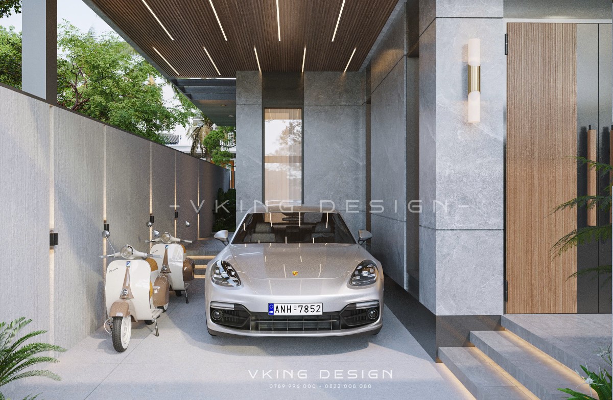 Trong thiết kế biệt thự phố hiện đại, gara ô tô là một yếu tố quan trọng giúp nâng cao sự tiện nghi cho gia chủ. Khu vực gara của căn biệt thự được bố trí ngay tại tầng một, thuận tiện cho việc di chuyển và sử dụng hàng ngày. Không gian này được thiết kế rộng rãi, có thể dễ dàng chứa một chiếc ô tô cùng các phương tiện khác như xe máy hoặc xe đạp. Phần mái che phía trên giúp bảo vệ phương tiện khỏi nắng mưa, đồng thời tạo nên sự liên kết hài hòa với kiến trúc tổng thể của ngôi nhà. Sàn gara được lát vật liệu chống trơn trượt, đảm bảo an toàn khi di chuyển. Ngoài ra, hệ thống chiếu sáng và thông gió cũng được tính toán kỹ lưỡng, giúp không gian luôn thoáng mát và sạch sẽ. Nhờ thiết kế thông minh này, gara không chỉ là nơi để xe mà còn trở thành một phần quan trọng trong tổng thể kiến trúc của căn biệt thự.