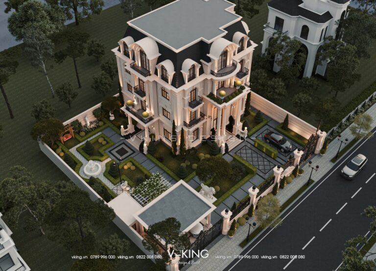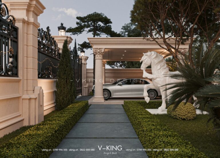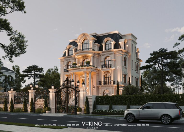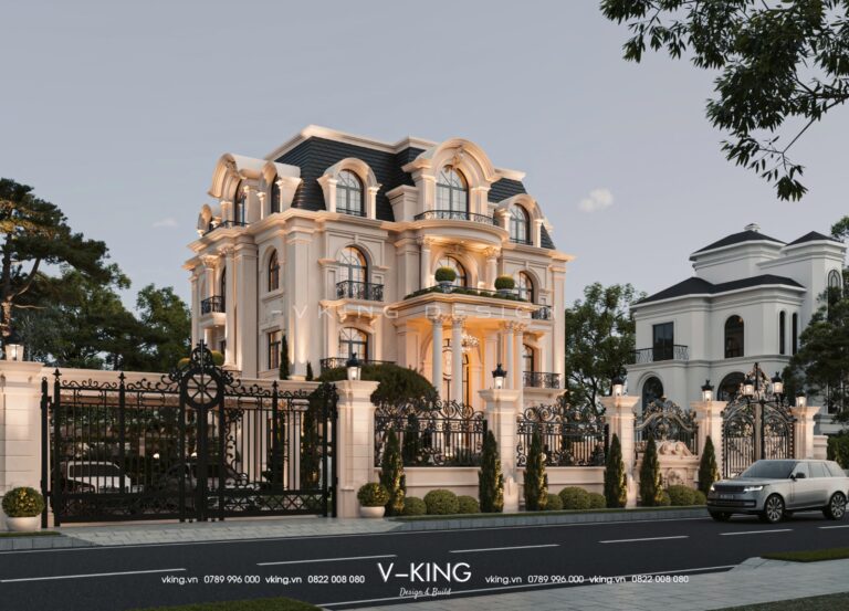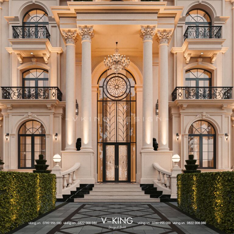 Bước qua cánh cổng sắt nghệ thuật được chạm khắc tinh xảo, ta như lạc vào một không gian kiến trúc hoàng gia nước Pháp – nơi hội tụ vẻ đẹp của thời đại, sang trọng và trường tồn theo năm tháng. Căn biệt thự tân cổ điển khoác lên mình vẻ ngoài đầy kiêu sa và quyền uy. Kiến trúc đối xứng và vững chãi khiến công trình trở thành điểm nhấn nổi bật giữa phố phường hiện đại. Cùng Kiến Trúc VKING khám phá công trình đậm chất nghệ thuật này qua từng chi tiết kiến trúc đắt giá trong bài viết dưới đây nhé!