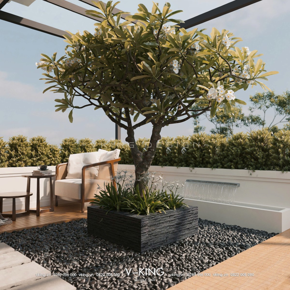 Khi ánh nắng chiều chiếu xuống tầng tum, căn nhà phố VK25030 hiện lên như một khu vườn trên cao bình yên và nên thơ. Nơi đây được thiết kế như một phòng khách ngoài trời, với mái kính che nắng mỏng nhẹ, khung sắt thanh mảnh mà chắc chắn, bao quanh bởi những dãy cây xanh mướt rì rào trong gió. Đó là không gian lý tưởng để thưởng trà, đọc sách. Giữa sự ồn ào và náo nhiệt của thành thị, tầng tum chính là khoảng trời riêng để tâm hồn tìm thấy sự cân bằng.