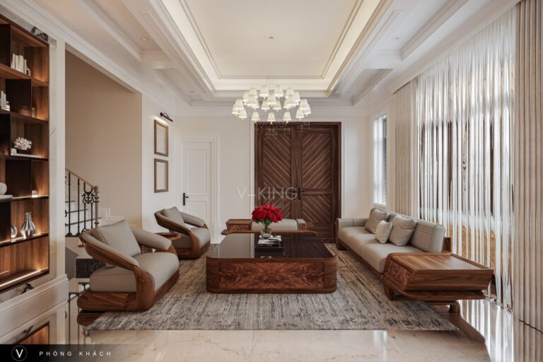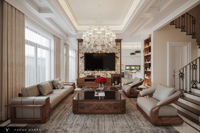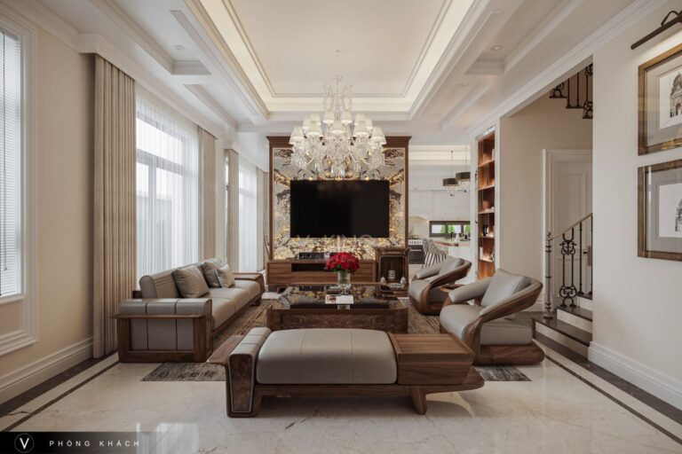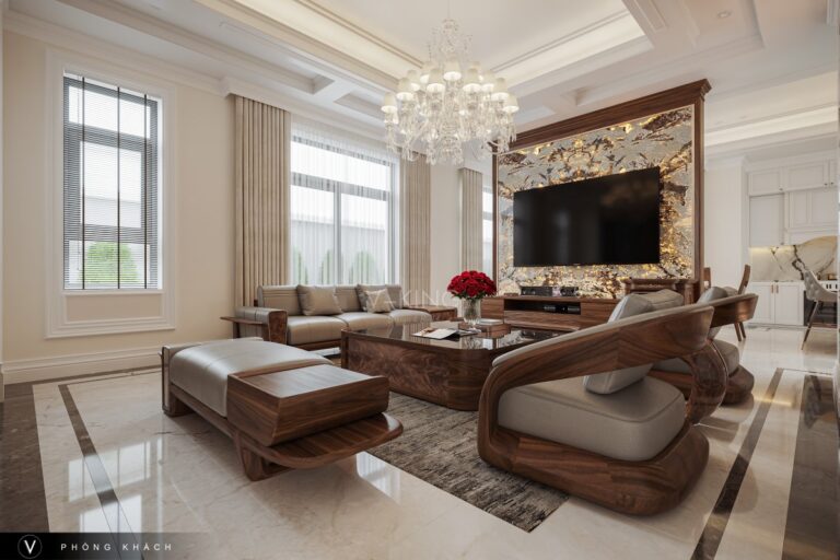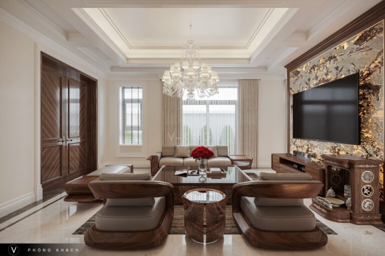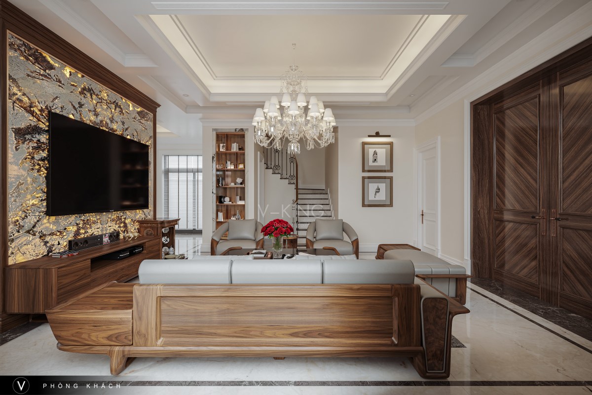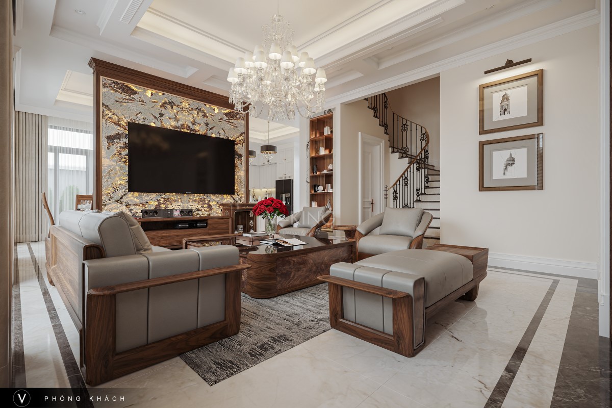 Phòng khách nổi bật với thiết kế nội thất sang trọng, thể hiện đẳng cấp và sự tinh tế. Bộ bàn ghế gỗ óc chó cao cấp là điểm nhấn chính tạo cảm giác ấm cúng và gần gũi nhưng không kém phần sang trọng. Diện tivi ốp đá xuyên sáng kết hợp hài hòa với ánh sáng tự nhiên tạo hiệu ứng độc đáo thu hút mọi ánh nhìn. Chiếc đèn chùm tinh xảo treo chính giữa không gian phòng khách, lan tỏa ánh sáng dịu nhẹ mang đến sự ấm cúng và xa hoa. Tủ đồ decor thiết kế âm tường giúp tối ưu diện tích, tạo cảm giác gọn gàng, thông thoáng mà vẫn lưu trữ đồ trang trí tinh tế. Trần thạch cao giật cấp tạo hiệu ứng không gian rộng thoáng, là nét đặc sắc giúp phòng khách thêm phần ấn tượng phù hợp với phong cách hiện đại và đẳng cấp.