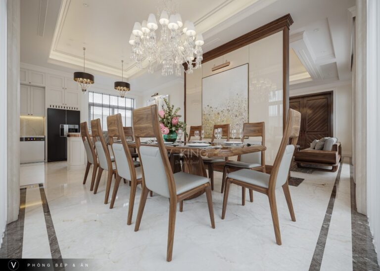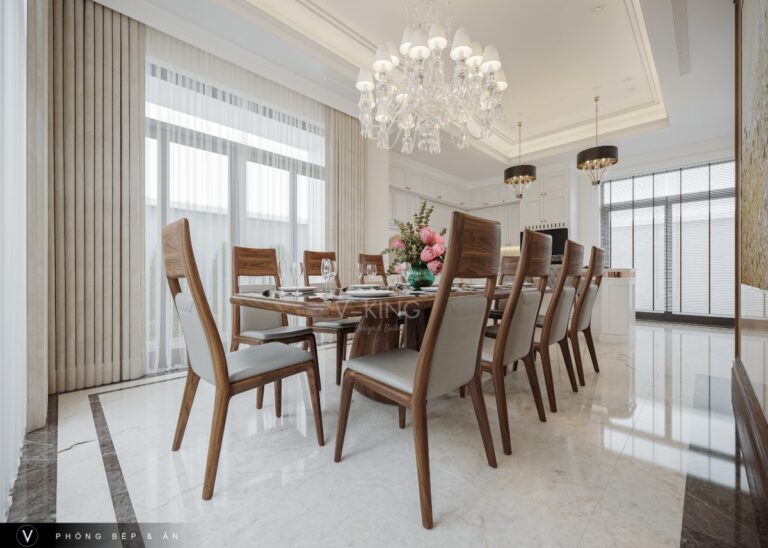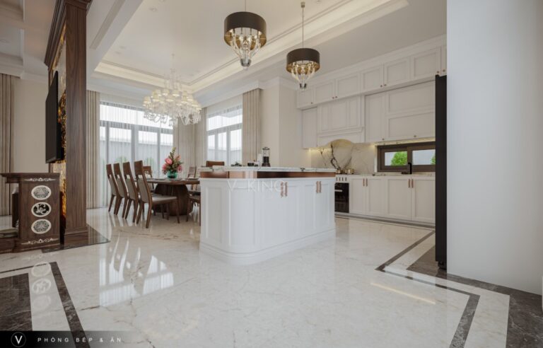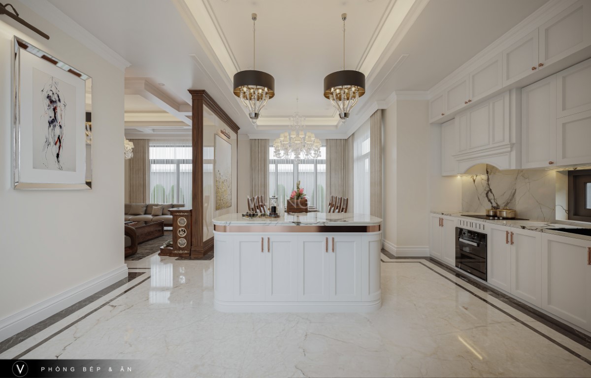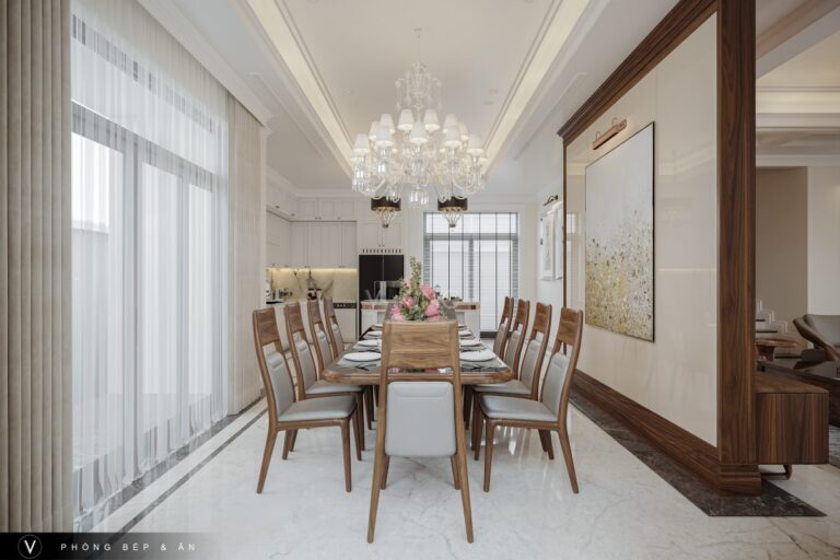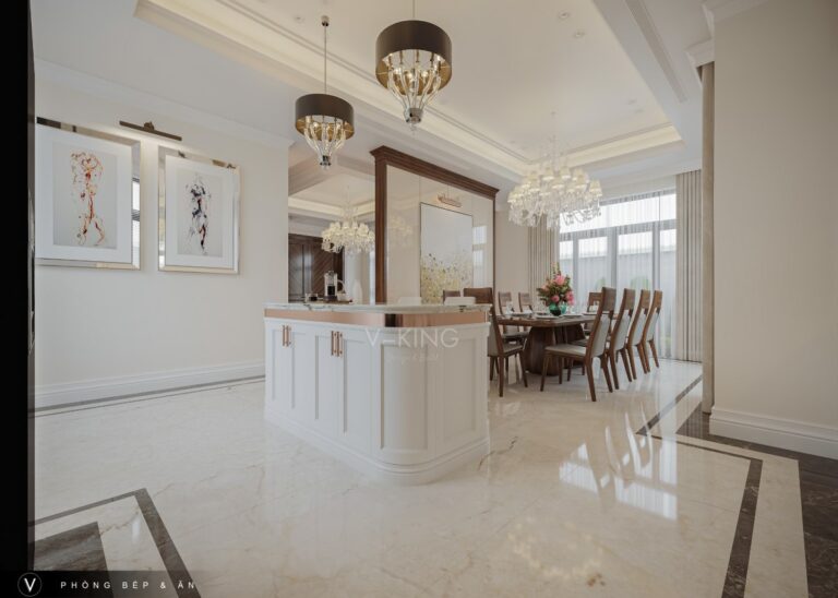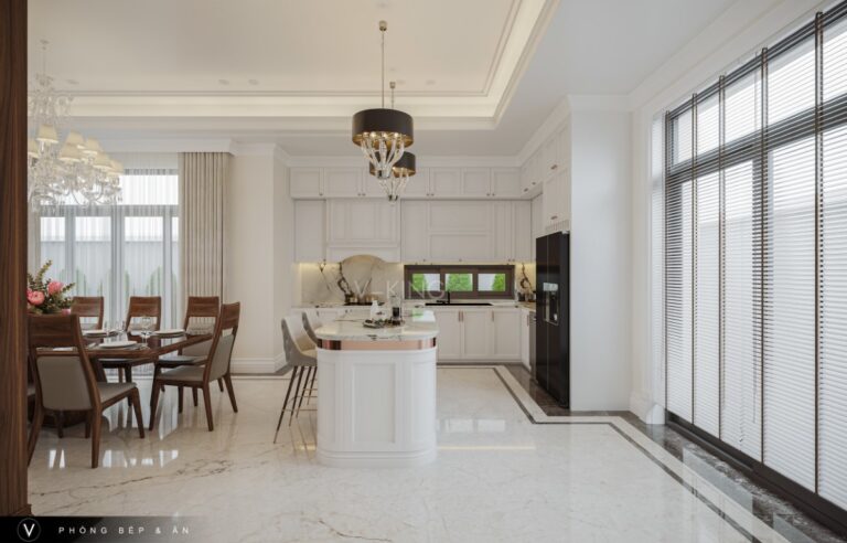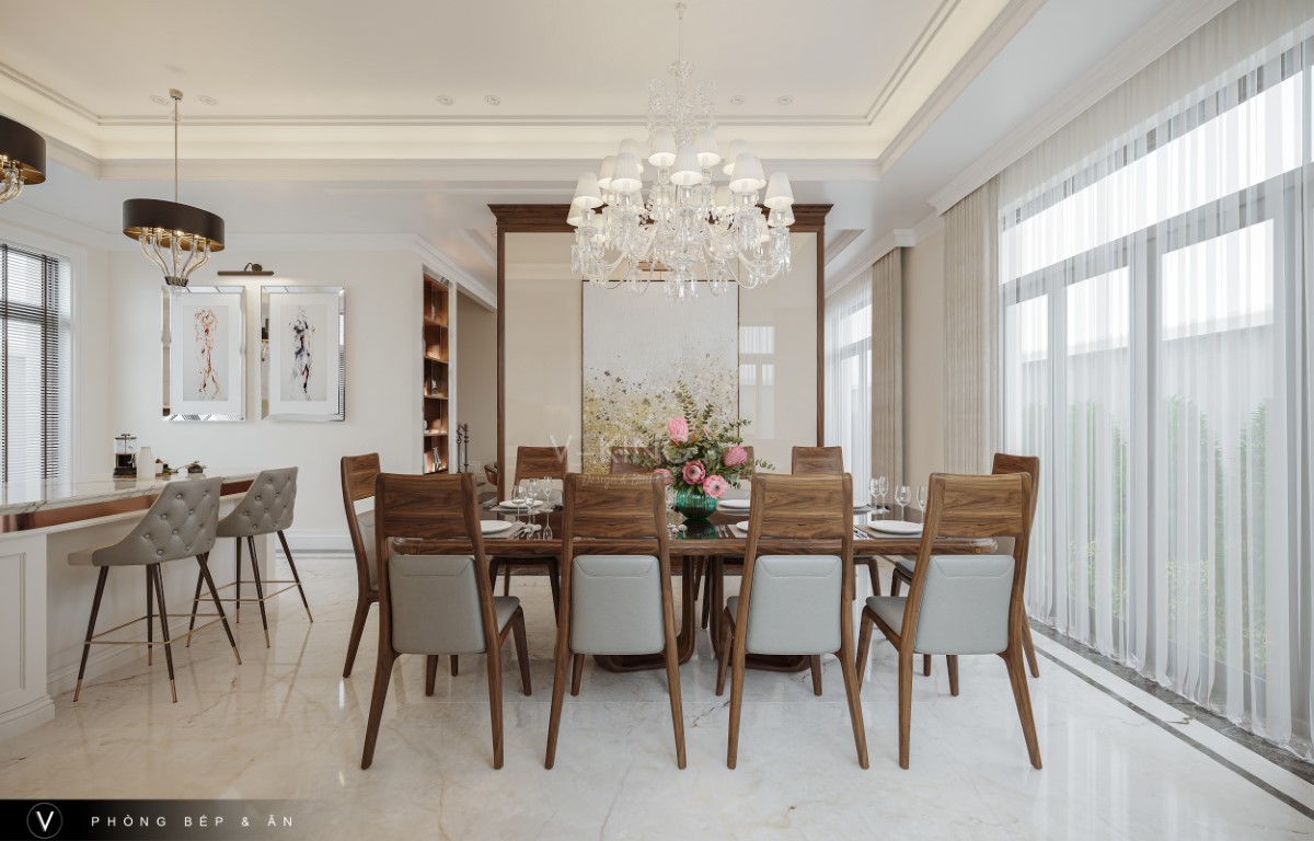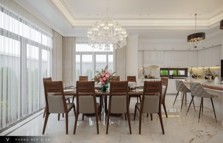Phòng bếp – ăn được thiết kế nổi bật với gam màu trắng tinh tế, mang lại cảm giác rộng rãi, sạch sẽ và hiện đại. Khu vực bàn đảo trung tâm bố trí hai chiếc đèn thả trần tạo điểm nhấn ấn tượng, vừa chiếu sáng hiệu quả, vừa tăng thêm phần sang trọng cho không gian bếp. Bộ bàn ăn lớn với sức chứa 10 người được làm từ gỗ óc chó cao cấp, tạo sự hài hòa với phong cách chung của ngôi nhà, phía trên là chiếc đèn chùm có kiểu dáng tương đồng với phòng khách, tạo sự kết nối xuyên suốt trong thiết kế nội thất. Phòng ăn thông thoáng nhờ hệ cửa kính lớn, cho tầm nhìn mở ra sân vườn xanh mát, mang thiên nhiên vào không gian sống. Hệ rèm che hai lớp tinh tế giúp dễ dàng điều chỉnh ánh sáng, tạo sự linh hoạt và thoải mái cho mọi bữa ăn gia đình.