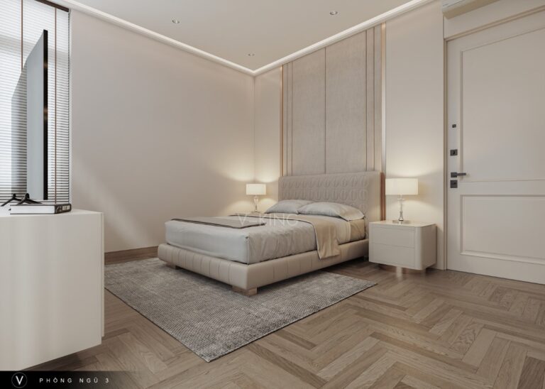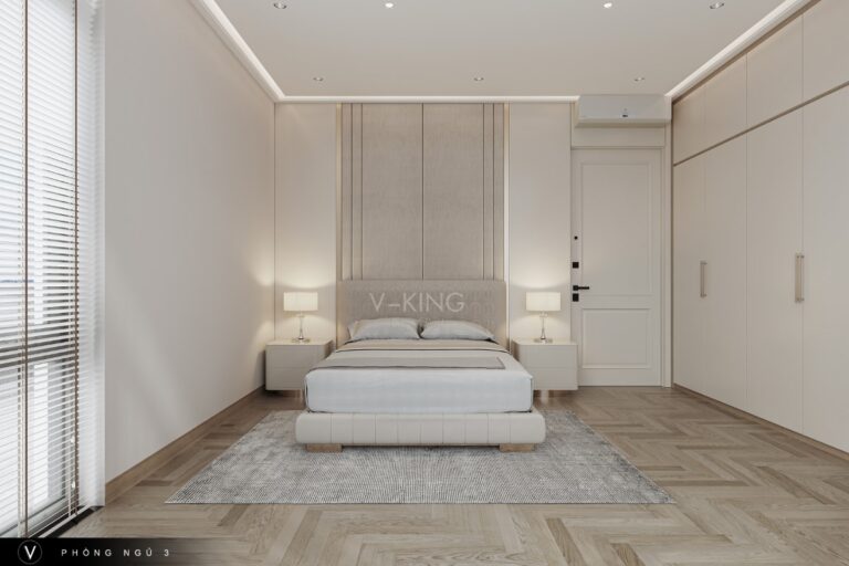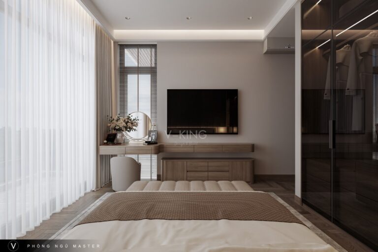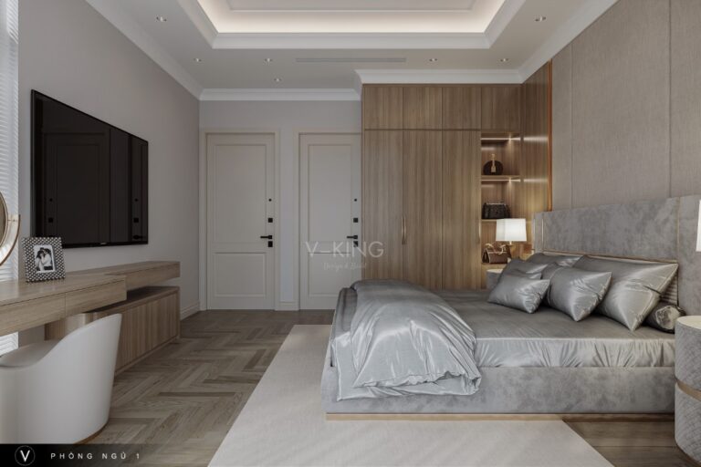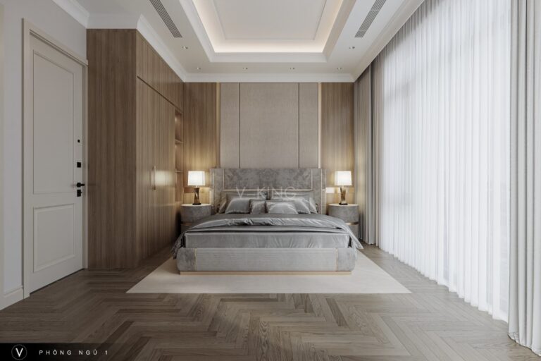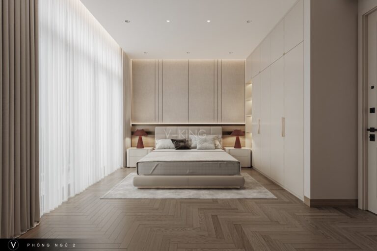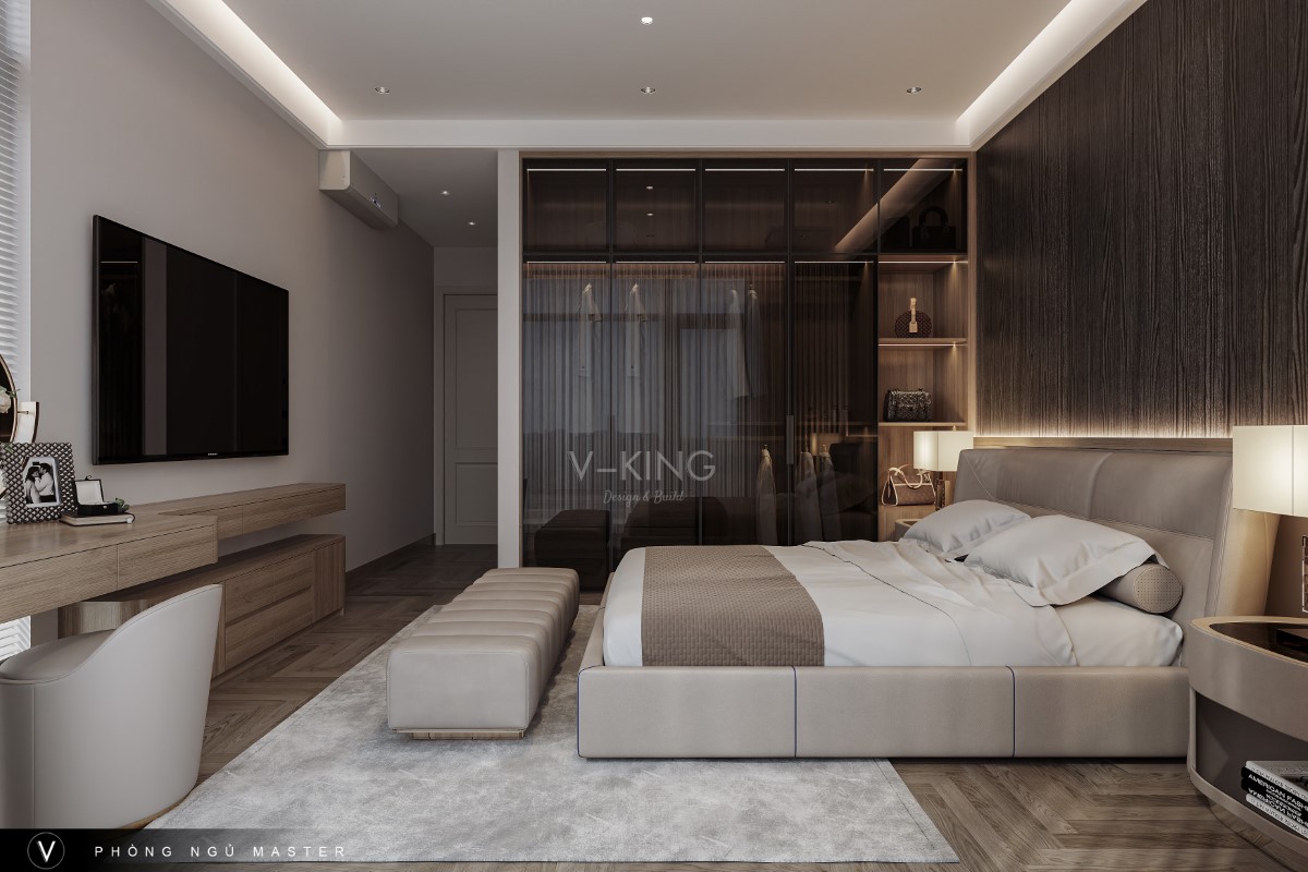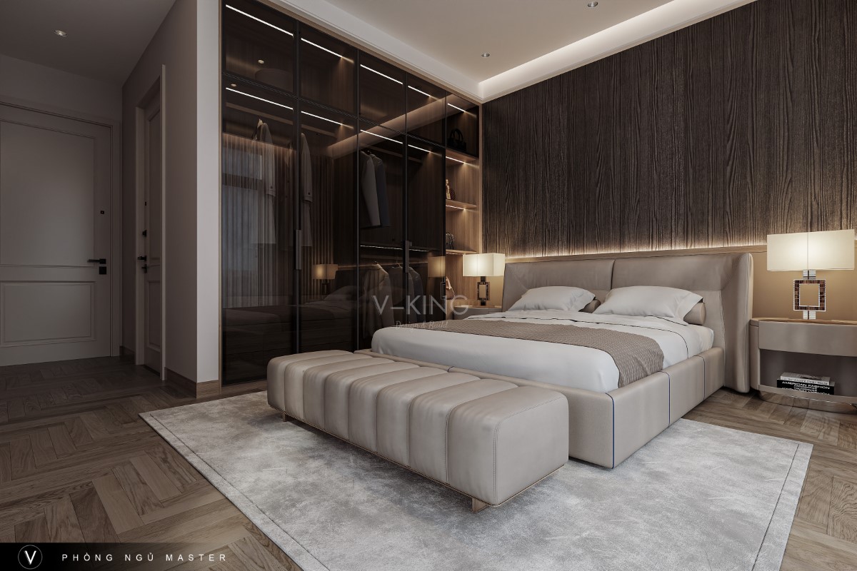 Phòng ngủ master được thiết kế với gam màu trang nhã mang đến không gian nghỉ ngơi thư giãn và ấm cúng. Vách đầu giường ốp gỗ tạo điểm nhấn ấm áp, đồng thời tăng tính thẩm mỹ và sự sang trọng cho không gian phòng ngủ. Tủ quần áo cánh kính hiện đại không chỉ tạo cảm giác rộng rãi mà còn giúp dễ dàng nhìn thấy và sắp xếp đồ đạc ngăn nắp. Trần thạch cao trơn được thiết kế đơn giản nhưng tinh tế, hài hòa với tổng thể, góp phần tạo nên sự nhẹ nhàng và thoáng đãng cho phòng ngủ master.