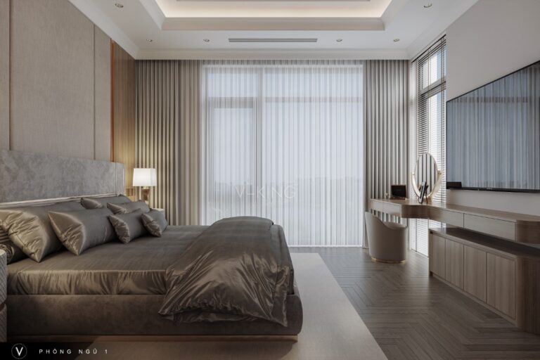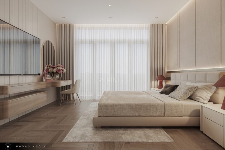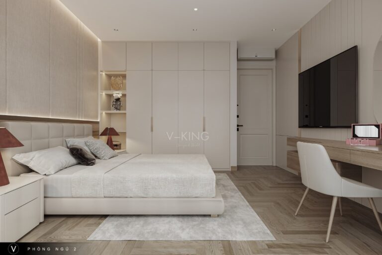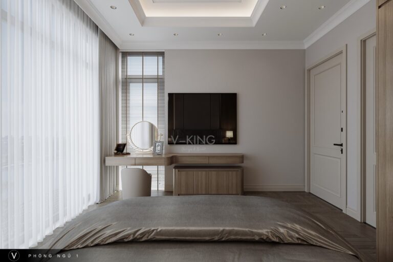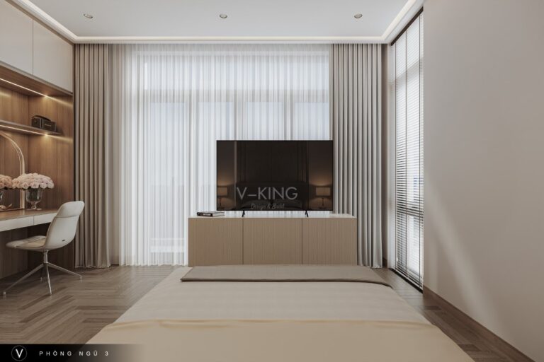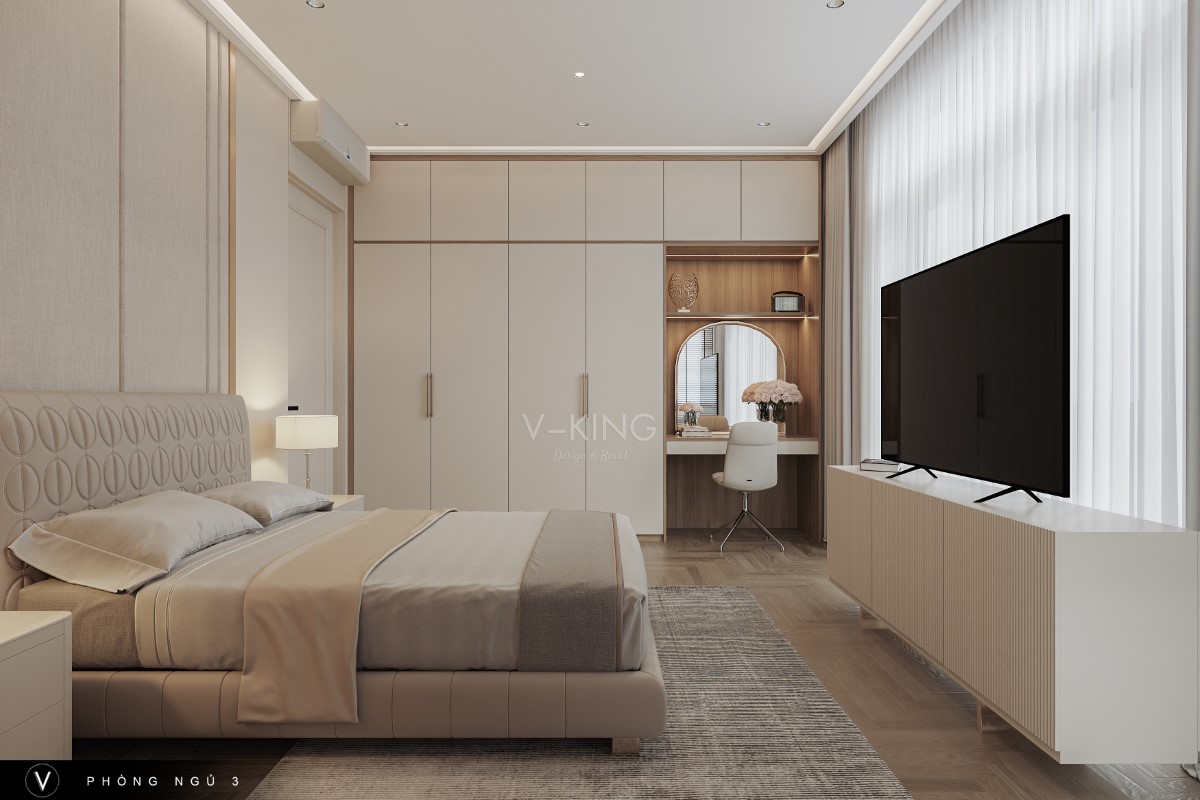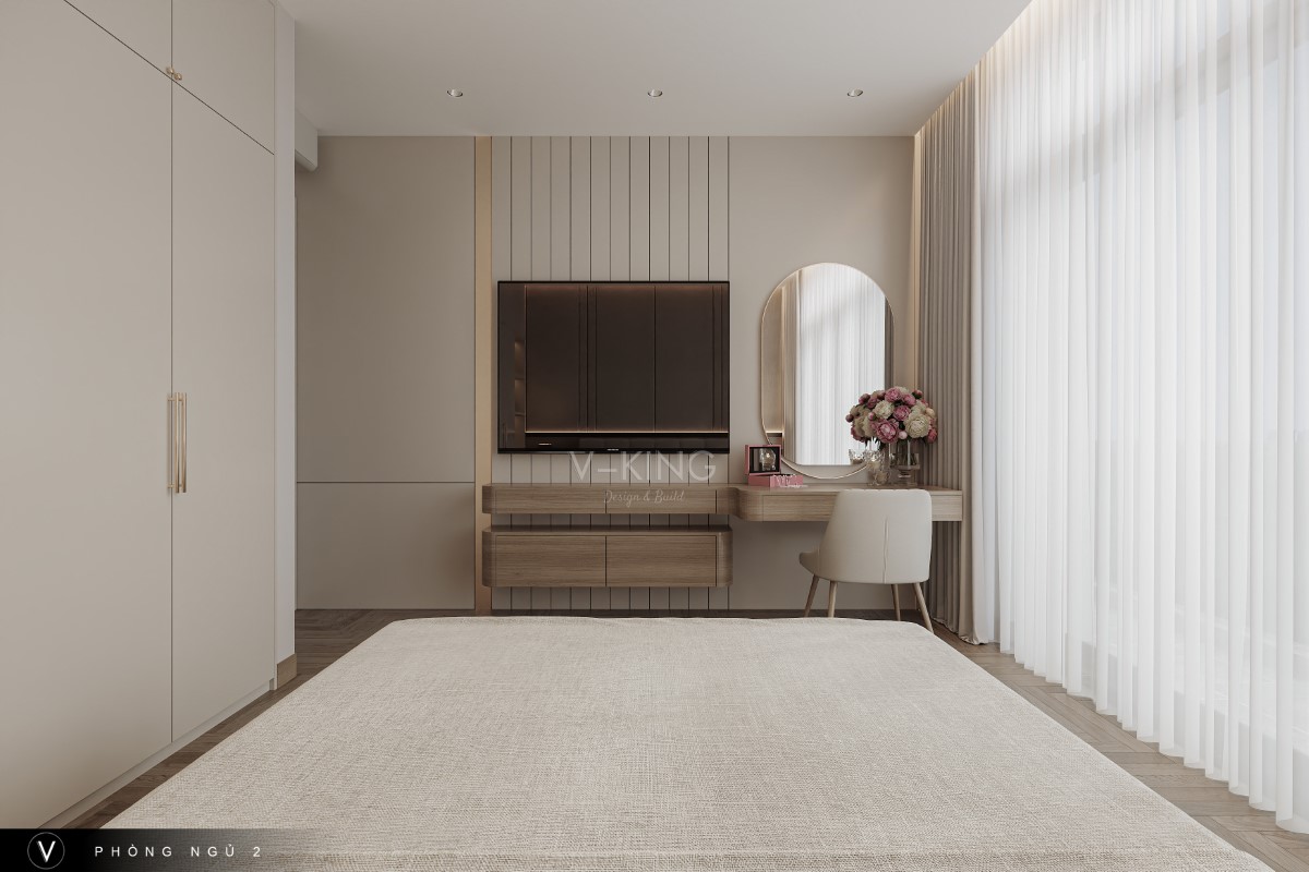 Căn phòng này được thiết kế với tính tiện ích cao, tối ưu hóa không gian bằng cách bố trí tủ quần áo kết hợp bàn trang điểm, vừa tiện lợi vừa tiết kiệm diện tích. Sự kết hợp giữa rèm vải 2 lớp và rèm mành mang đến khả năng điều chỉnh ánh sáng linh hoạt mà vẫn duy trì được sự hài hòa, không làm phá vỡ tổng thể không gian. Chiếc giường bọc da sang trọng tạo điểm nhấn đẳng cấp, kết hợp với các chi tiết nội thất tinh tế, mang lại cảm giác êm ái và thoải mái, đáp ứng nhu cầu nghỉ ngơi và thư giãn một cách hoàn hảo.