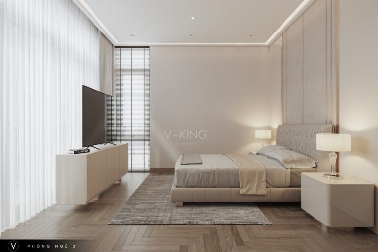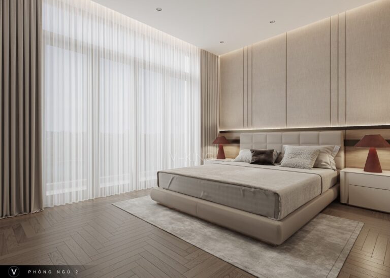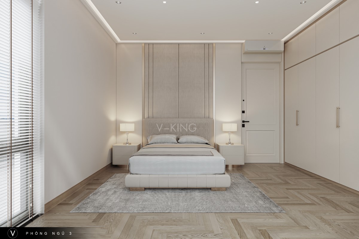 Mỗi căn phòng ngủ trong ngôi nhà đều mang màu sắc và phong cách riêng biệt, tạo nên sự đa dạng và hấp dẫn cho không gian sống. Căn phòng này được thiết kế nhẹ nhàng, có phần nữ tính với gam màu be dịu dàng mang lại cảm giác ấm áp và thư thái. Vách đầu giường được bọc vải nỉ mềm mại, tạo điểm nhấn tinh tế và sang trọng. Đặc biệt, tất cả các phòng ngủ đều được bố trí tại những không gian thoáng, có cửa kính lớn, giúp kết nối với thiên nhiên và đón ánh sáng tự nhiên. Rèm che 2 lớp cho phép điều chỉnh ánh sáng linh hoạt, đảm bảo sự riêng tư và tạo nên không gian nghỉ ngơi lý tưởng, phù hợp với từng nhu cầu và sở thích.