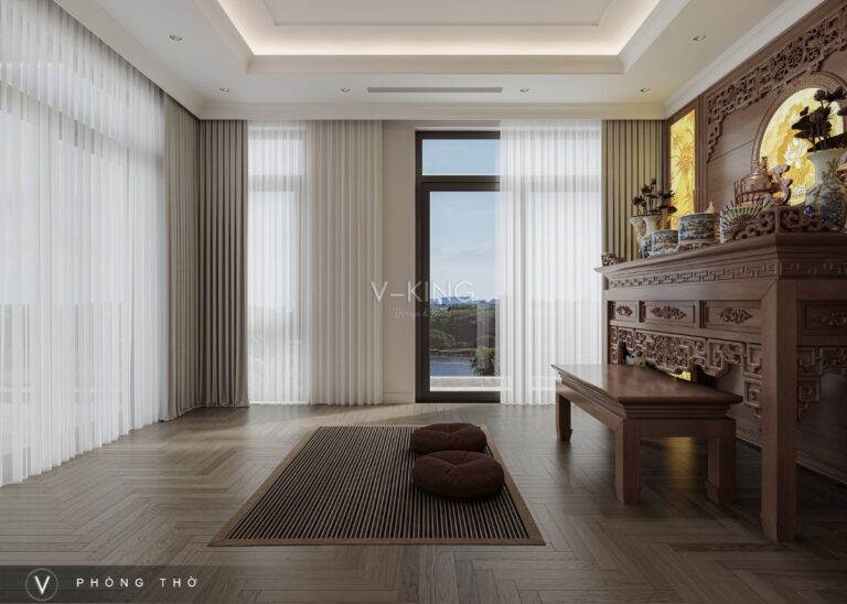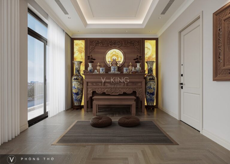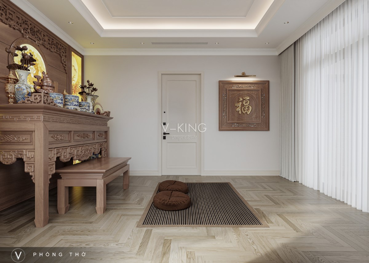 Khu vực thờ được thiết kế trang nghiêm và giản dị, thể hiện sự tôn kính với không gian linh thiêng của ngôi nhà. Các chi tiết chủ yếu làm từ gỗ, mang đến cảm giác ấm cúng và gần gũi. Diện thờ bằng gỗ được chế tác tinh tế, là điểm nhấn trung tâm của không gian thờ cúng. Ở mặt hông, một bức tranh gỗ điêu khắc tỉ mỉ treo trang trọng, góp phần tạo nên vẻ đẹp trang nghiêm và uy nghi, phù hợp với không gian truyền thống. Thiết kế tối giản, tinh tế giúp khu vực thờ toát lên sự thanh tịnh và trang trọng.